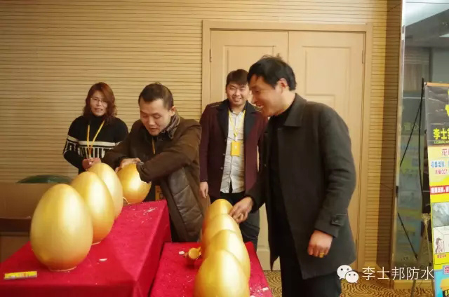 在会议接近尾声前,李士邦为了表达对与会者的厚爱,特地组织了“交订金,砸金蛋,中大奖”的活动,与会者纷纷参与,其中千秋镇喜中特等奖32寸TCL液晶彩电一台,黄沙河镇喜中一等奖全自动洗衣机一台,其他奖项有联想平板电脑、紫兰玉家纺四件套、美的电水壶等,本次会议累计订货额7.1万元,9个镇确认开设李士邦专卖店。