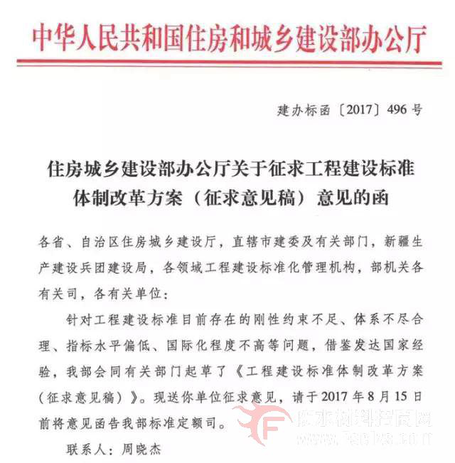 近日,住建部办公厅发布了《关于征求工程建设标准体制改革方案(征求意见稿)意见的函》。改革方案(征求意见稿)明确提出,要提升工程规范和标准水平,其中,将提升防水等隐蔽工程薄弱环节指标要求作为提升住房品质要求的重要内容。方案(征求意见稿)同时提出,大力发展团体、企业标准,政府主导制定的推荐性标准逐步由社会承接;要将技术指标水平全面提升至国际领先、先进,促进我国工程建设水平整体稳步提升;技术表达方式要全面适应国际化需求,在内容要素、指标构成等方面,提高与国际标准的一致性。