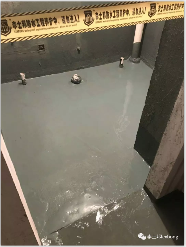 卫生间防水基层要用水泥砂浆进行找平处理,清洗干净后先后刷李士邦高分子抗裂防水胶浆。