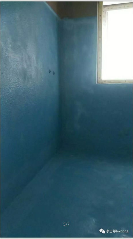3、完工后要用24小时“蓄水试验”验收地面防水,做好封口后在卫生间地面蓄满水到一定高度,并做好标记,24小时内液面若无明显下降,地面防水则达到要求。