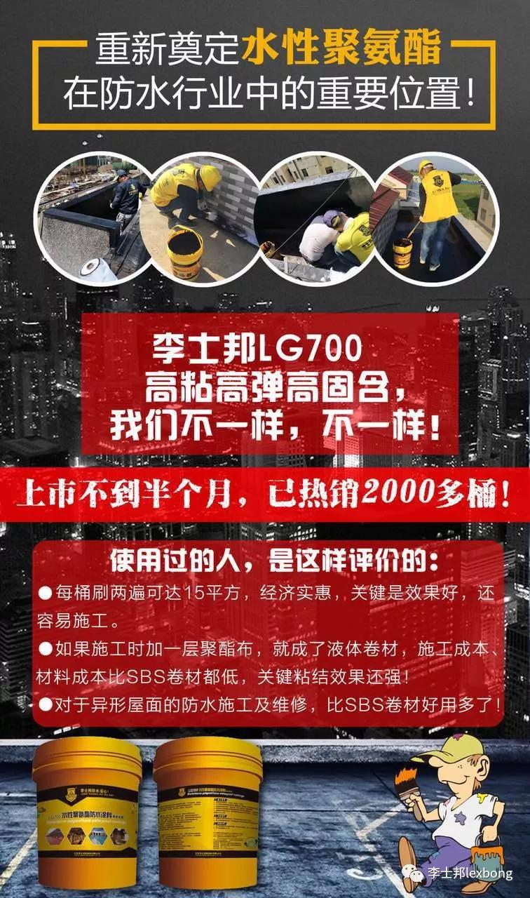 李士邦(LG700-水性聚氨酯防水涂料)就能彻底解决传统卷材带来的弊端。可以形成整体无接缝封闭层,防水慨念完全,可以完全隔气隔水,完全可以隔绝外界雨水、潮气、一切有害气体对防水基层的侵害;液体卷材施工技术容易撑握,施工设备简单,不受基层任何复杂形状的限制都可做成连续整体的防水层。