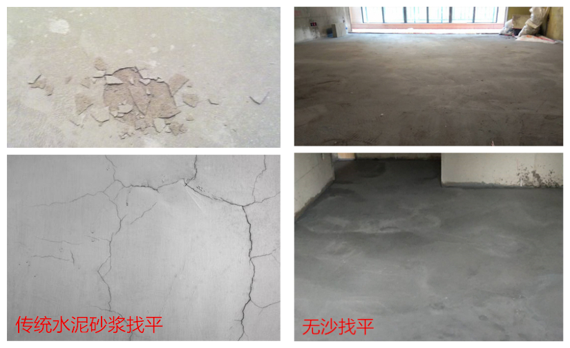 最后我们看下效果方面的对比,水泥砂浆找平不细致的地方会出现空鼓现象,这是最为常见的问题,随之而来的就是裂缝,脱皮、起沙、接荐不平等缺陷。